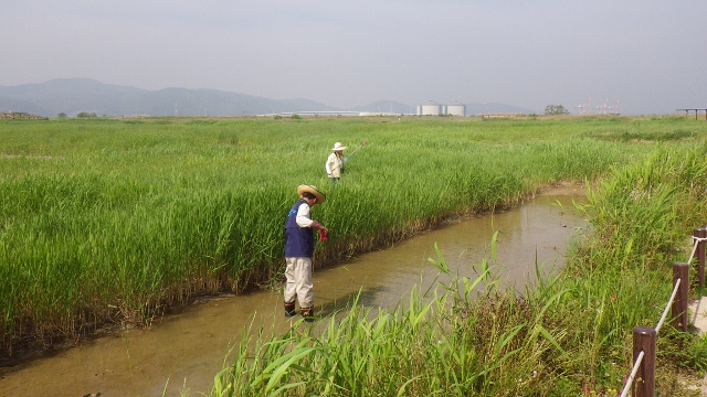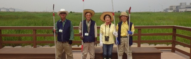 響灘ビオトープ愛好会は12名のメンバーからなるボランティアのグループです。昨年より、ビオトープをフィールドに生物調査や整備作業などを精力的におこなっております。今年も湿地ではジャンボタニシの卵塊が目立ってきましたので、土日を中心に駆除作業を始めました。希少な水生植物を食べ荒らしてしまうジャンボタニシ。きつい割には地味ですが大切な作業です。見かけたら声をかけてくださいね。