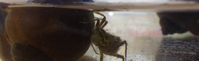 本日のビオトープでは、トンボのヤゴとジャンボタニシの子供が戯れているのが見られました。