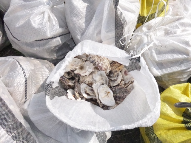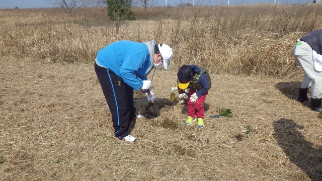 植え替えが終わると砂れき地へ移動。野鳥の会の方が集めてこられた貝殻をまきました。