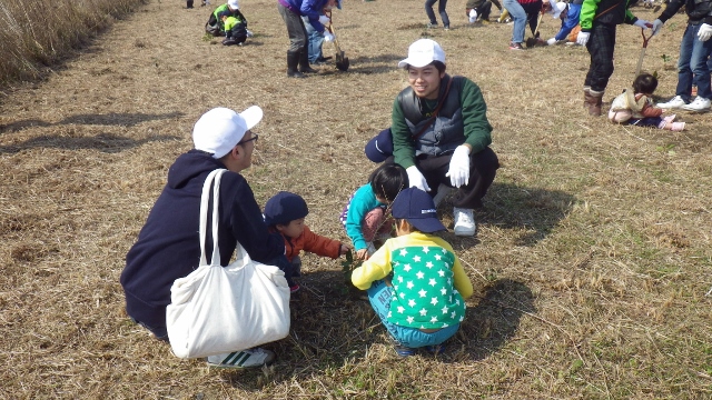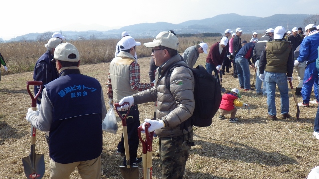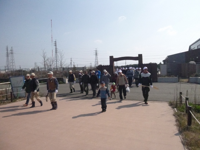 3月16日、響灘ビオトープ愛好会主催で幼木の植え替えイベントを行いました。当日はブリヂストンさんから66名、野鳥の会の方7名、ひびき灘開発から5名、一般参加の方など7名の総勢85名が集まり、賑やかに始まりました。まずネイチャーセンターの講義室で響灘ビオトープ愛好会の瀧本会長からの挨拶がありました。