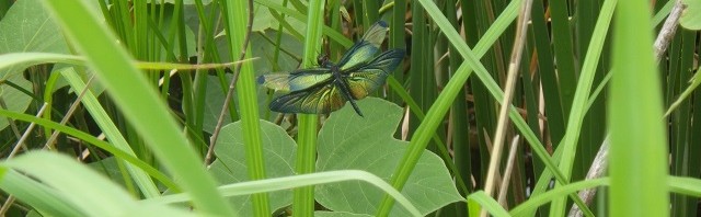 蝶のようにひらひら飛び、光の当たる角度によっては七色に輝くきれいなトンボです。
