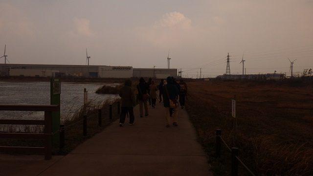 風が大変強く、また気温も低い中、12名の参加がありました。防寒対策万全に、出発!