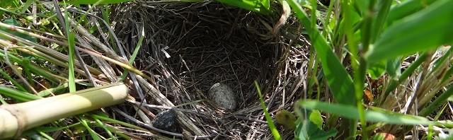 ヒバリの巣です。卵は一つだけ確認できました。親の姿はいたるところで見られますが、巣が見つかるのはまれです。無事育ちますように。