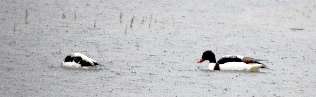 先日から時々見られるツクシガモ。雨の中、今日は2羽に増えていました。