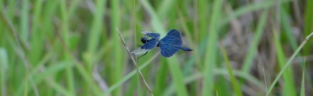 光の当たり方で七色に輝く羽をもつきれいなトンボです。
