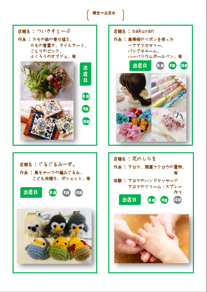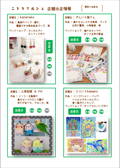 10月8日(土)~10月10日(月・祝)に開催される、ことりマルシェに出店されるハンドメイド作家様の店舗情報を公開します