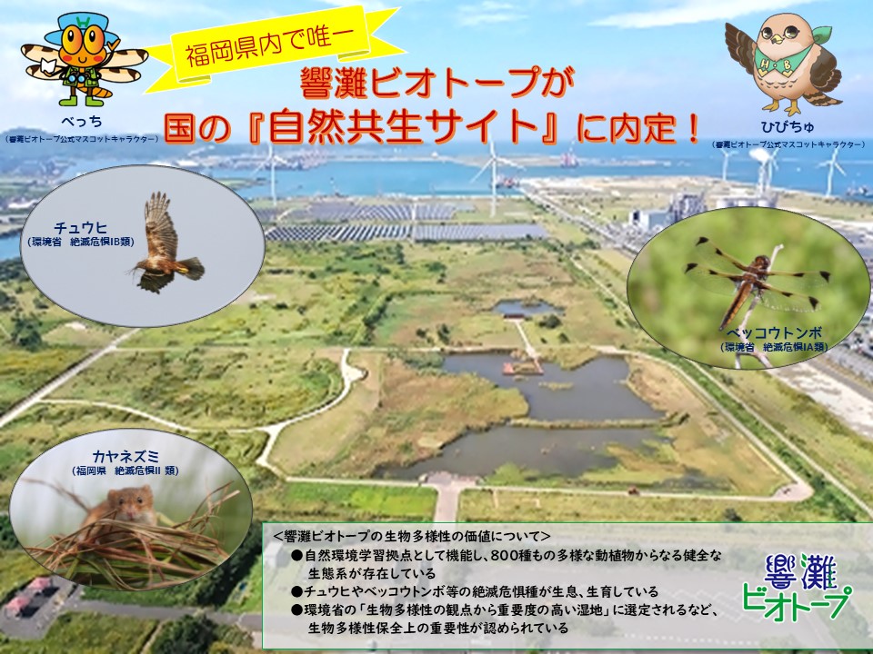 響灘ビオトープ(若松区)には、ベッコウトンボ(昆虫類)やチュウヒ(鳥類)などの数多くの生物が生息し、自然とのふれあいや生物多様性の保全を進める拠点となっており、今回の内定により、世界目標の達成についても、貢献していくことになります。