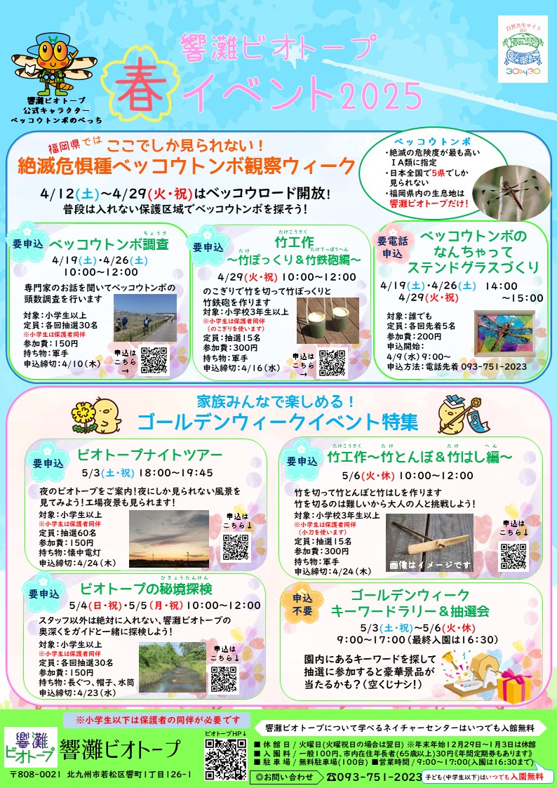 この時期にしか見られないベッコウトンボの調査イベントやGW期間中のキーワードラリーなどイベントが盛りだくさんです!