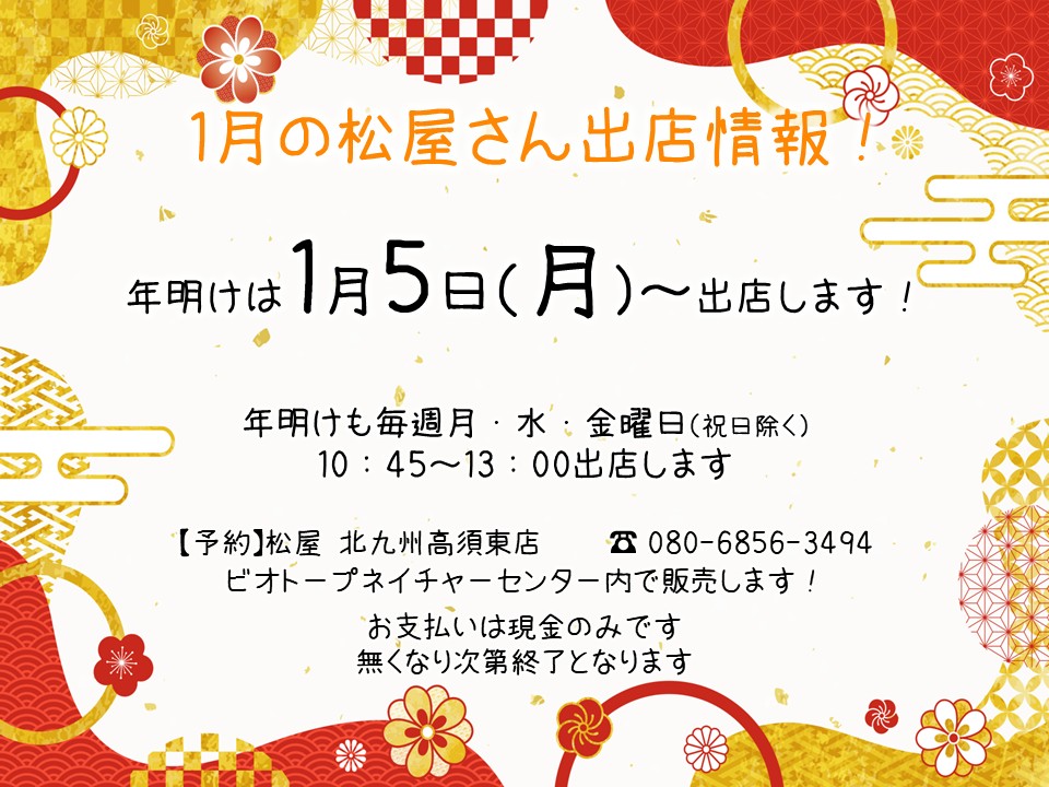 2025年12月29日~2026年1月4日は響灘ビオトープが休園となっているため、松屋さんの出店もお休みとなっていますのであらかじめご了承ください。