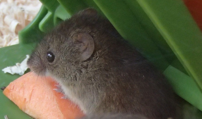 まだ衣替え途中なので、まだらにグレー色の毛も混じっていますが、もう少ししたら綺麗な茶色の毛のカヤネズミを見ることができると思います。是非、見に来てください♪
