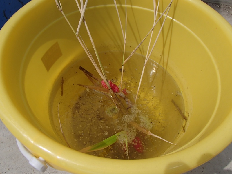 バケツの中にたっぷりの水とジャンボタニシの卵を入れて、本当に孵化しないか実験中です。