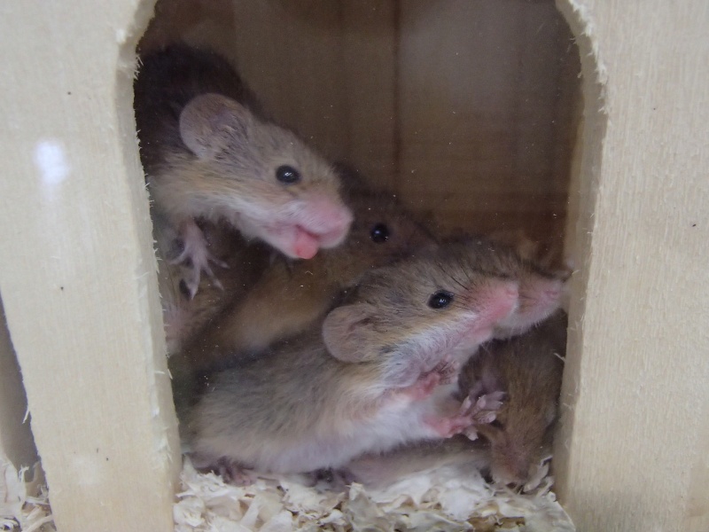 10月の終わり、少しずつ寒くなってきたころ…。響灘ビオトープで展示中のカヤネズミが2回目の繁殖を迎えました。前回と違い今回は生まれた数が多く、7匹もの赤ちゃんが誕生。展示ケース内も賑やかになりました。産まれて1ヶ月近く経ち、赤ちゃんたちもだいぶ大きくなりましたが、大人に比べるとまだまだ小さくて可愛い。最近では、昼間でも出てきてケース内を走り回る姿が確認できるほど元気!!まだ、オスメスがわからず、名前もなかなか付けれませんが、これからの赤ちゃんたちの成長が楽しみな今日この頃です。