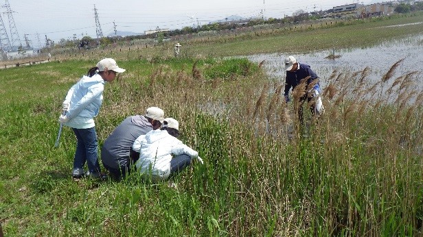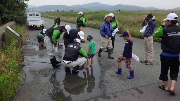 株式会社ブリヂストン北九州工場の社員の方々、そしてそのご家族の方々と共に、恒例のジャンボタニシの駆除を行いました。