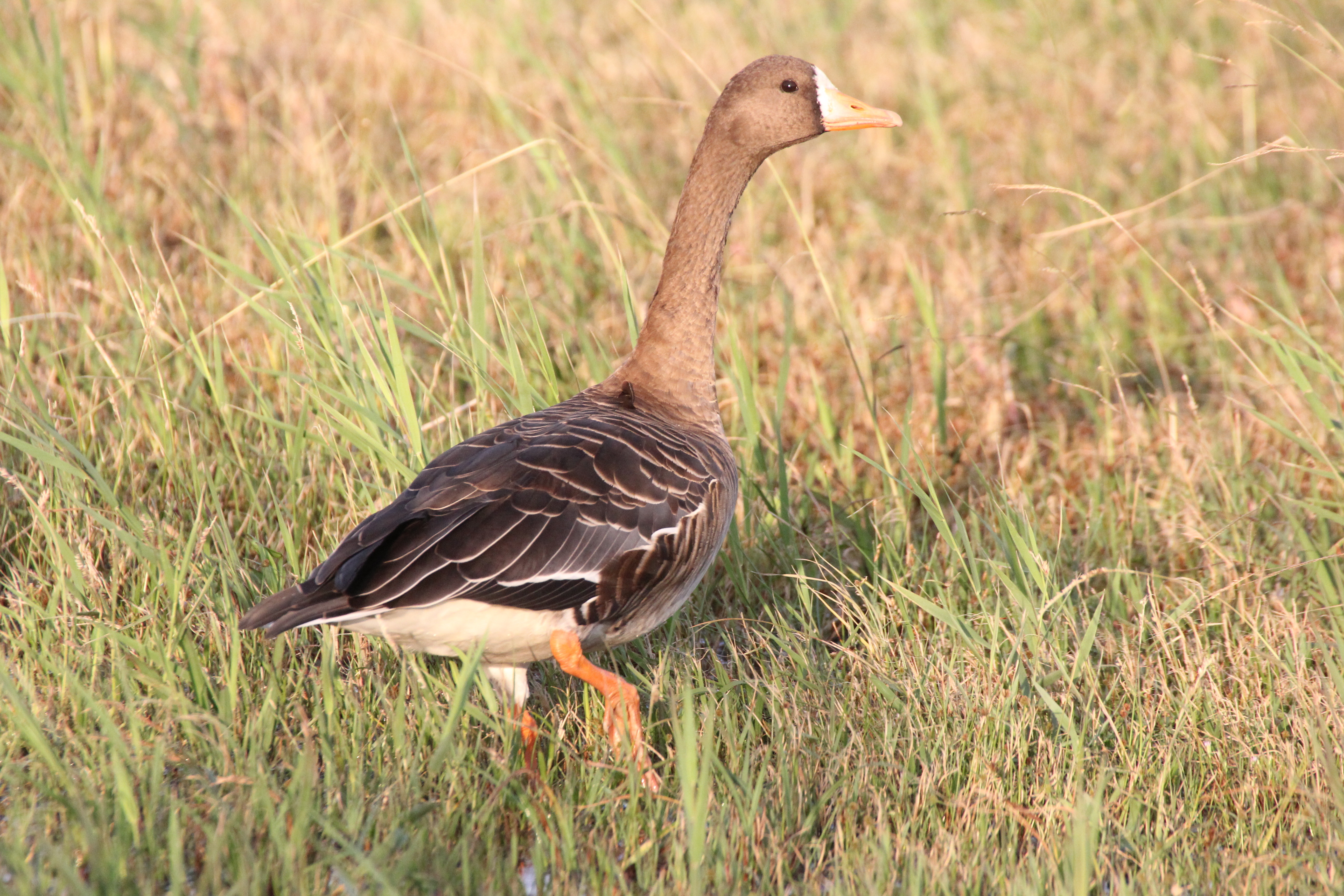 こちらは準絶滅危惧種のマガン。国の天然記念物に指定されています。全長72cm、翼を広げると1.4m程になる大型のガンで、日本には冬鳥としてやって来ます。ねぐらとする湖沼を夜明けとともに飛び立ち、いくつかの家族からなる群れで採餌場に向かいます。日中に落ち穂や青草などを食べ、夕暮れには雁行と呼ばれる美しいV字編隊を組んでねぐらの湖沼に戻っていきます。着水姿勢に入った時には、翼を開いた状態で体を左右に揺らしながら、まるで落ち葉が舞い落ちるように着水します。これを落雁(らくがん)といいます。