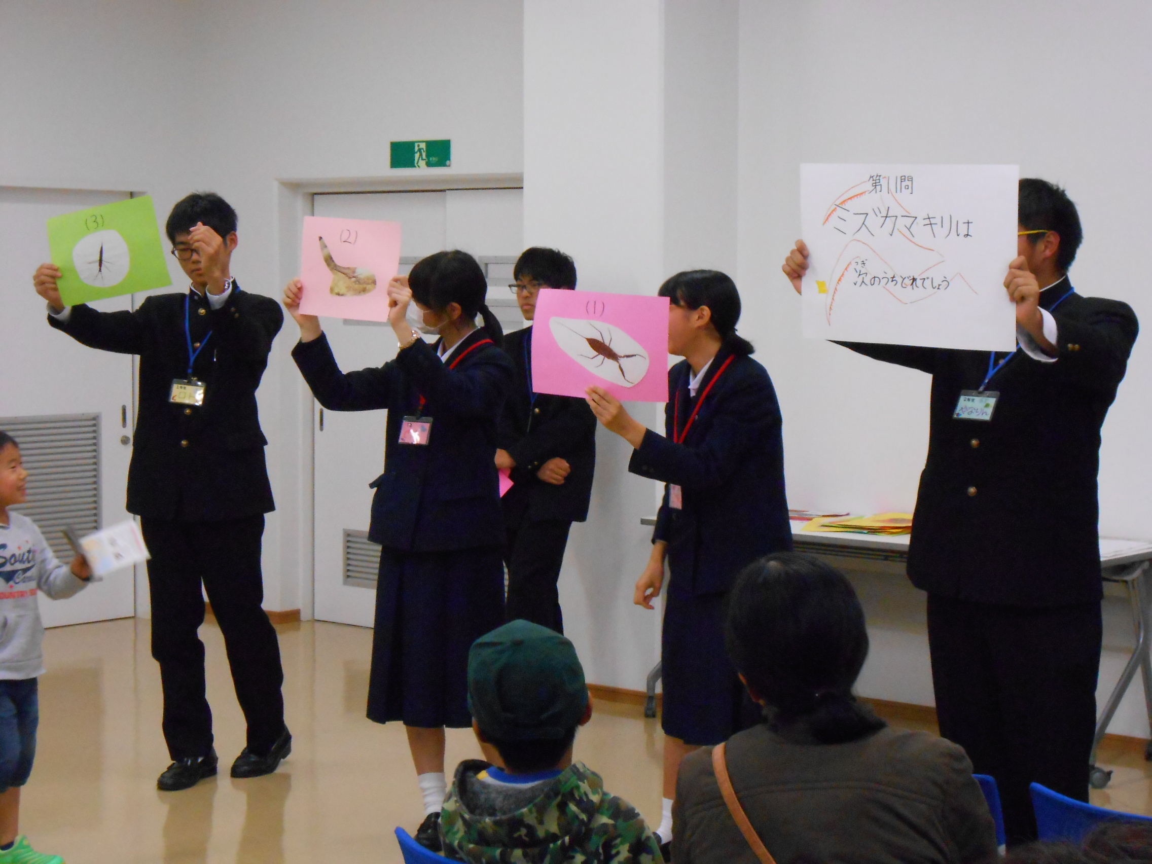 11月11日(土)に、県立北九州高等学校・魚部(ぎょぶ)の生徒さんを講師に招き、人気企画「いきもののおはなし」を開催しました。河川の構造やそこに住む生き物について、小さいお子様にも解りやすく解説して頂きました。お話の後は、クイズやゲームを通して楽しみながら生き物について学んでいただきました。