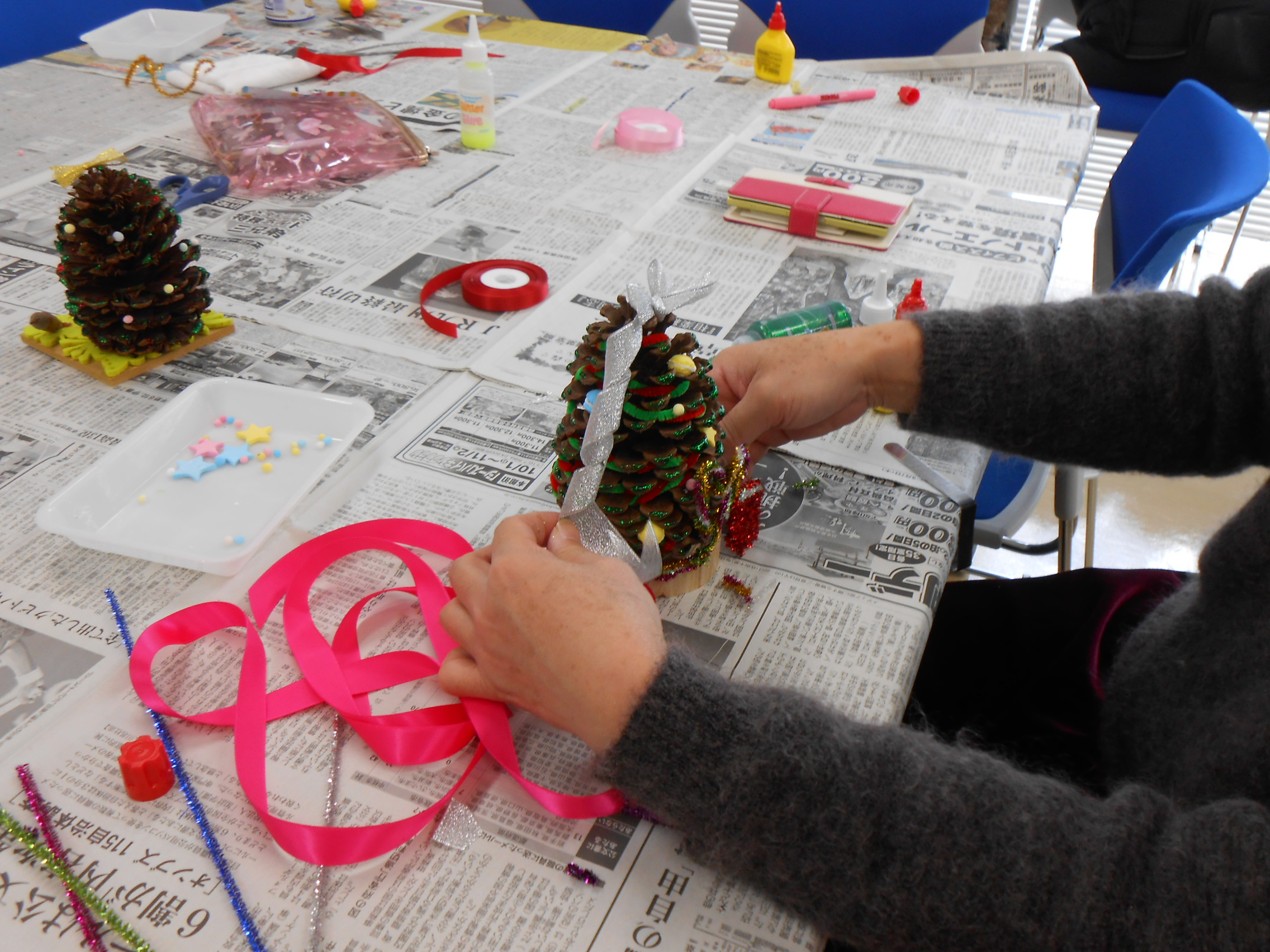 11月19日(日)には、カラフルに色づけされた松ぼっくりを使って、かわいらしいミニクリスマスツリーを作りました。