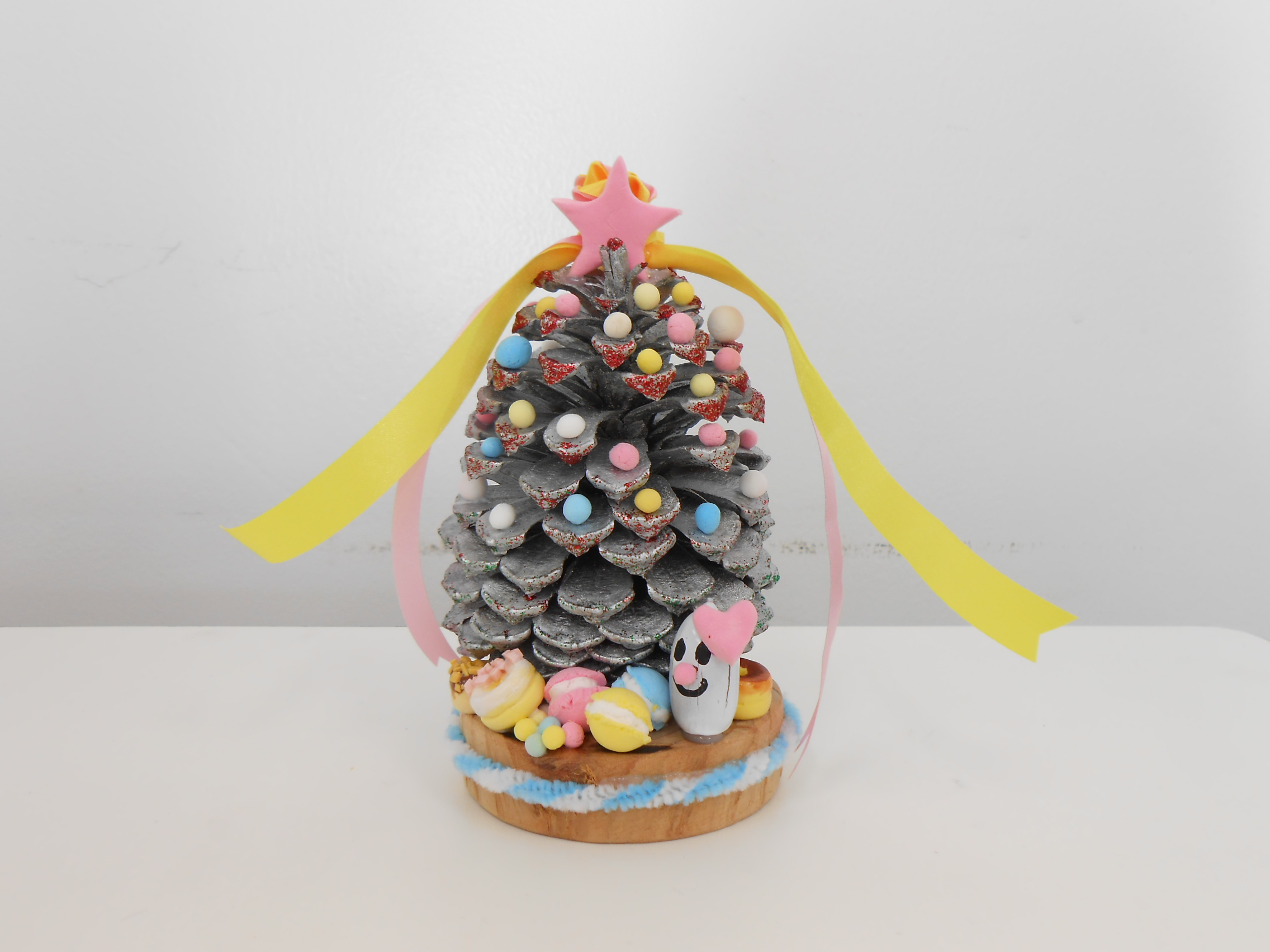 紙粘土製のミニスイーツやどんぐりでできた雪だるまなどを飾り、世界で一つだけのクリスマスツリーです♪
